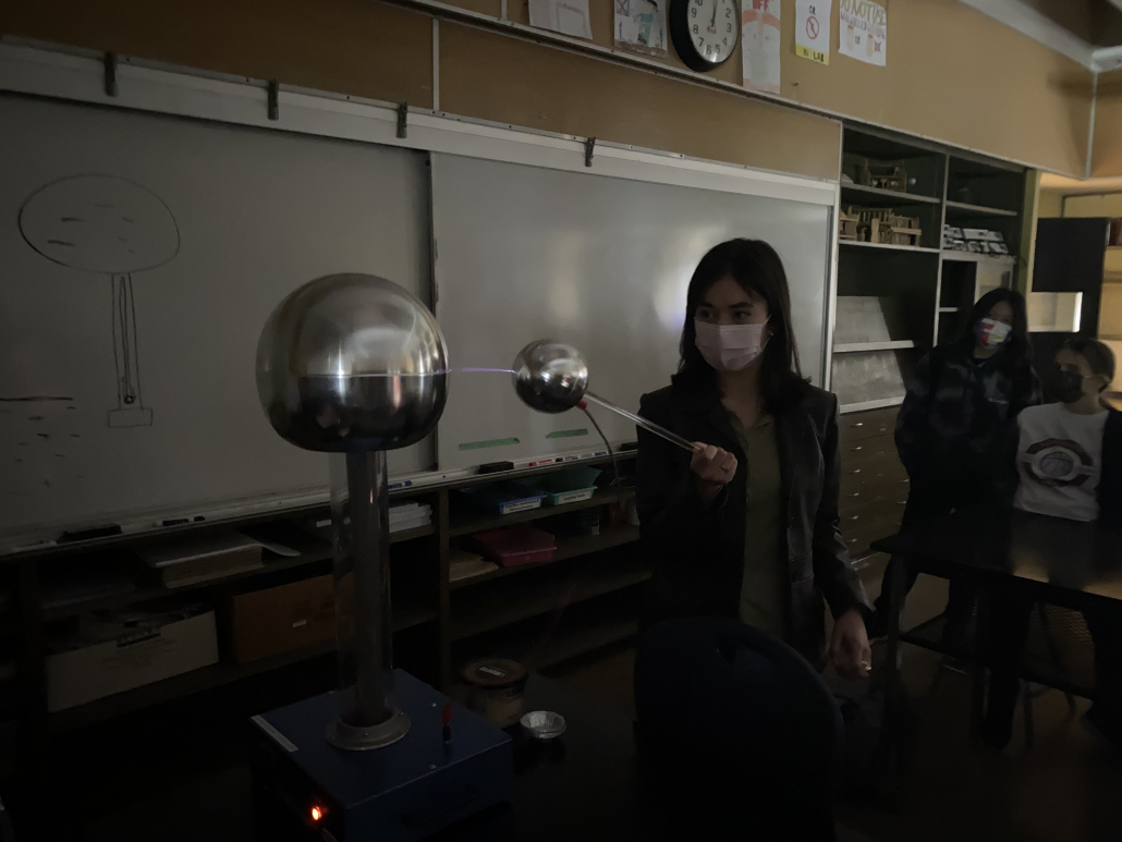 The first demonstration involved a dazzling lightning show. The dome was allowed to charge for some time then grounded in milliseconds using a grounding rod held several centimetres away from it. With the lights off, members could see a stream of electrons travelling between the rod and the dome, creating a blue fluorescent glow.